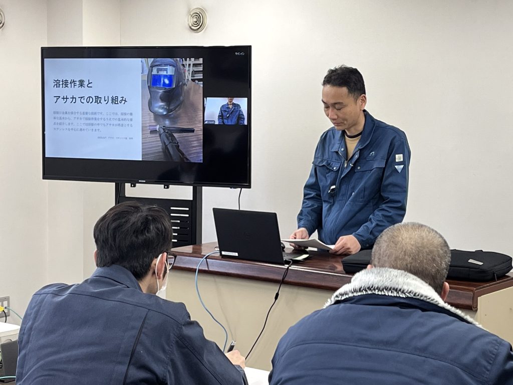 講義内容は弊社で行われている溶接の特徴や強み、工夫についてのお話が中心で、実際の作例や作業動画についても詳しく解説をいただきました。