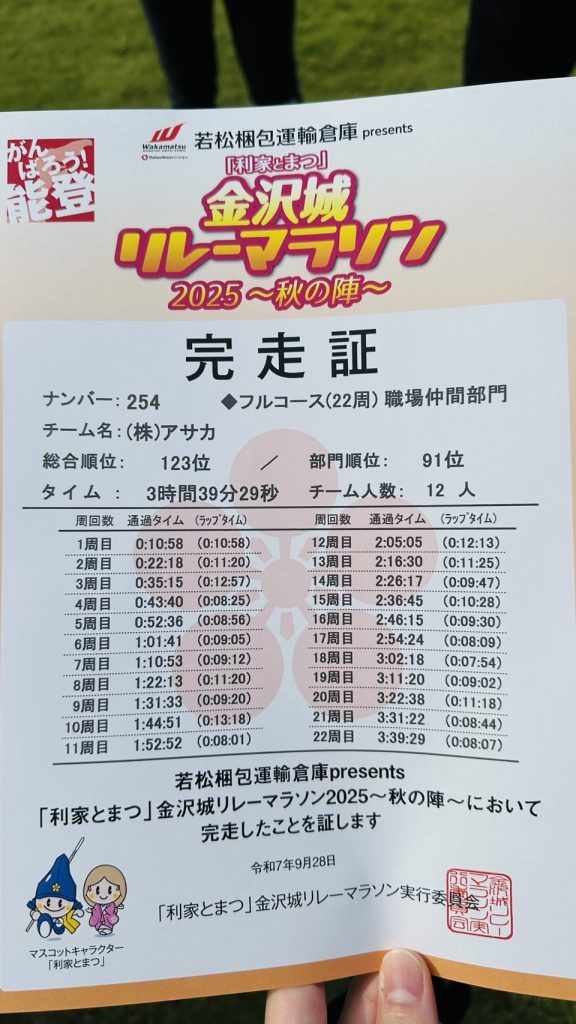 5月の春の陣に続く挑戦となった今回、当社からは2チームがエントリー。フルコース職場仲間部門(42.195km(22周))17名、ハーフコース一般部門(21.0975km(11周))に5名が参加し、歴史ある金沢城公園内の特設コースをチーム一丸となって一本のタスキを繋ぎました。